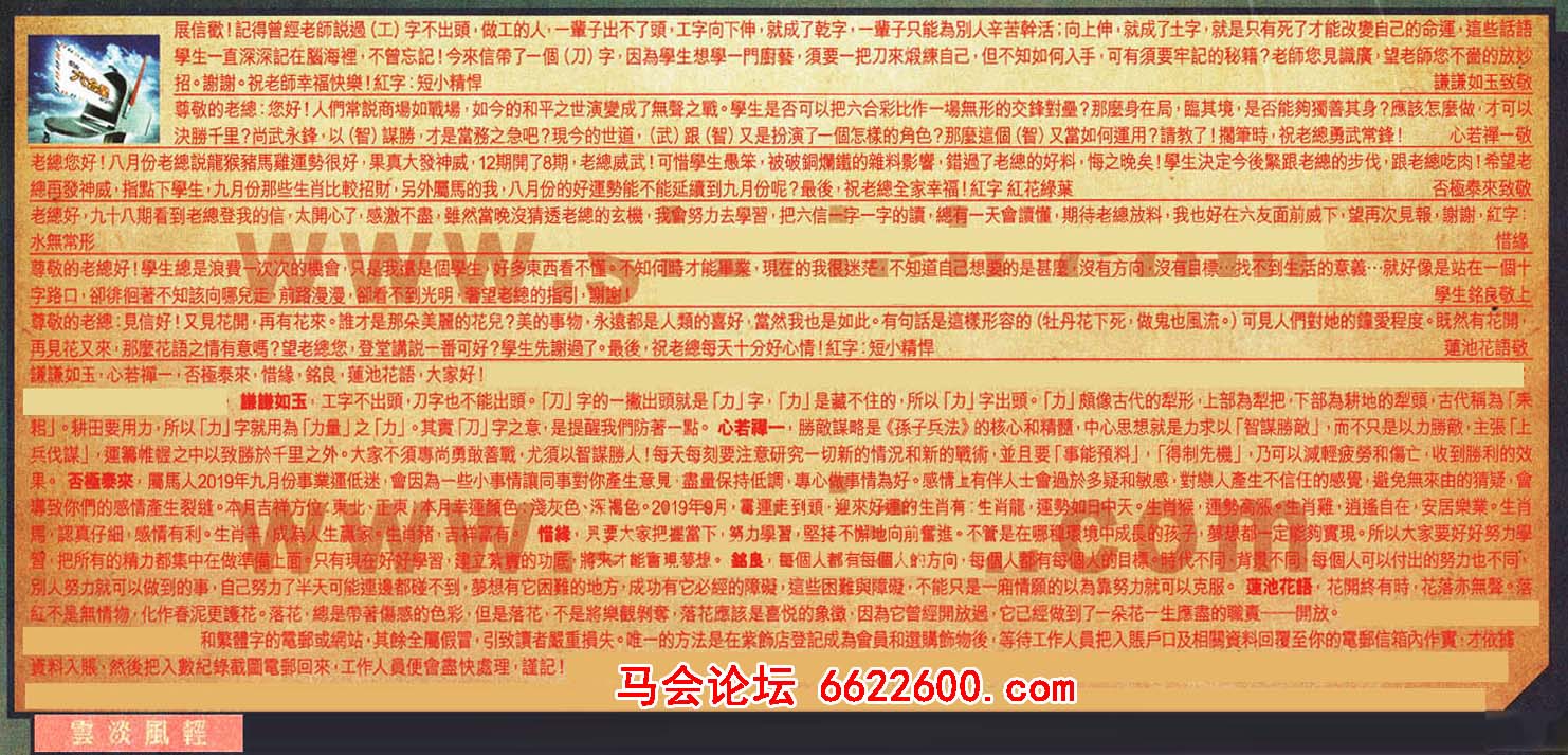 【4】.老總好,九十八期看到老總登我的信,太開心了,感激不盡,雖然當晚沒猜透老總的玄機,我會努力去學習,把六信一字一字的讀,總有一天會讀懂,期待老總放料,我也好在六友面前威下,望再次見報,謝謝,紅字:水無常形 惜緣