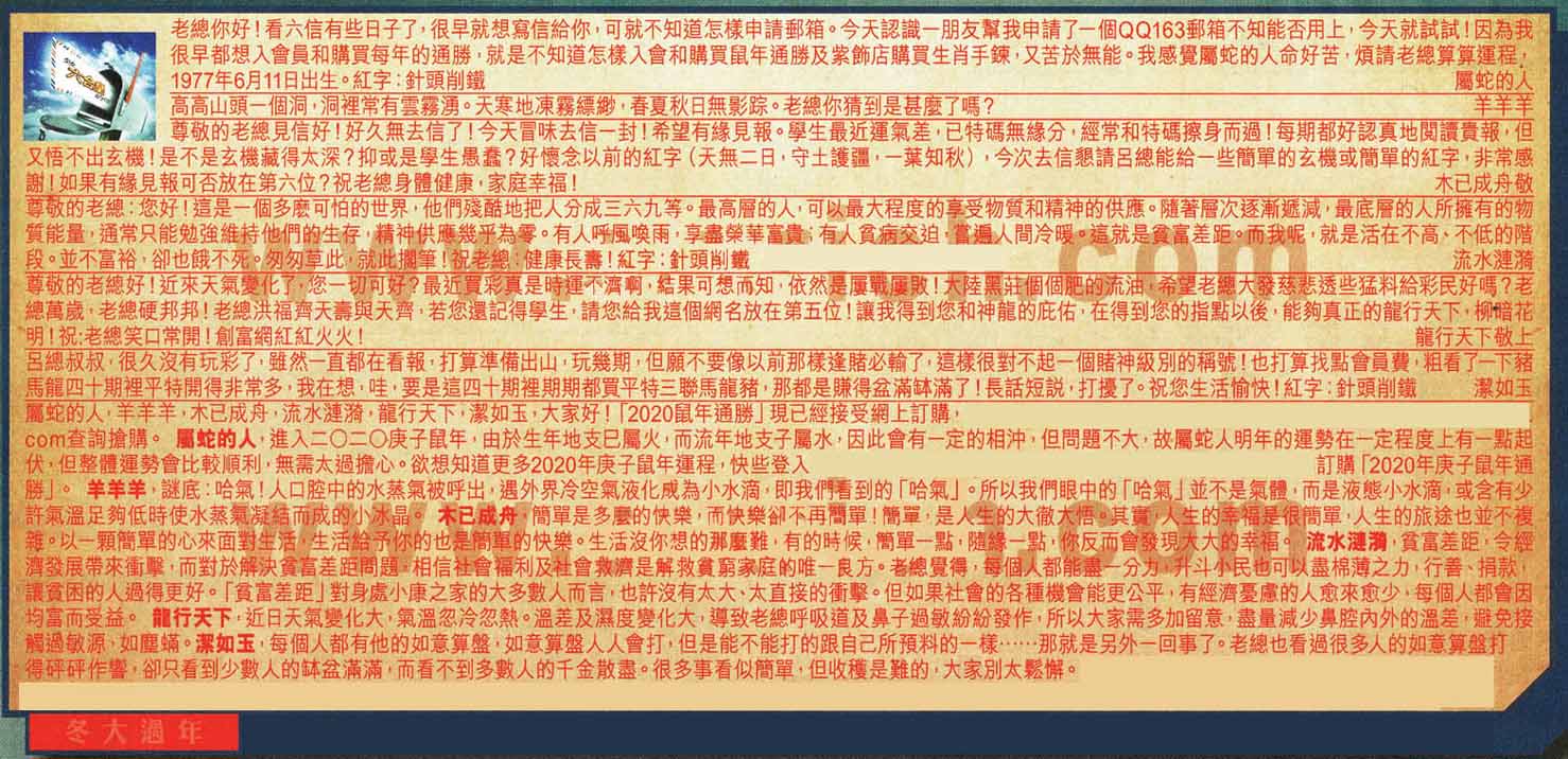 【1】老總你好!看六信有些日子了,很早就想寫信給你,可就不知道怎樣申請郵箱。今天認識一朋友幫我申請了一個QQ163郵箱不知能否用上,今天就試試!因為我很早都想入會員和購買每年的通勝,就是不知道怎樣入會和購買鼠年通勝及紫飾店購買生肖手錸,又苦於無能。我感覺屬蛇的人命好苦,煩請老總算算運程,1977年6月11日出生。紅字:針頭削鐵-----屬蛇的人
