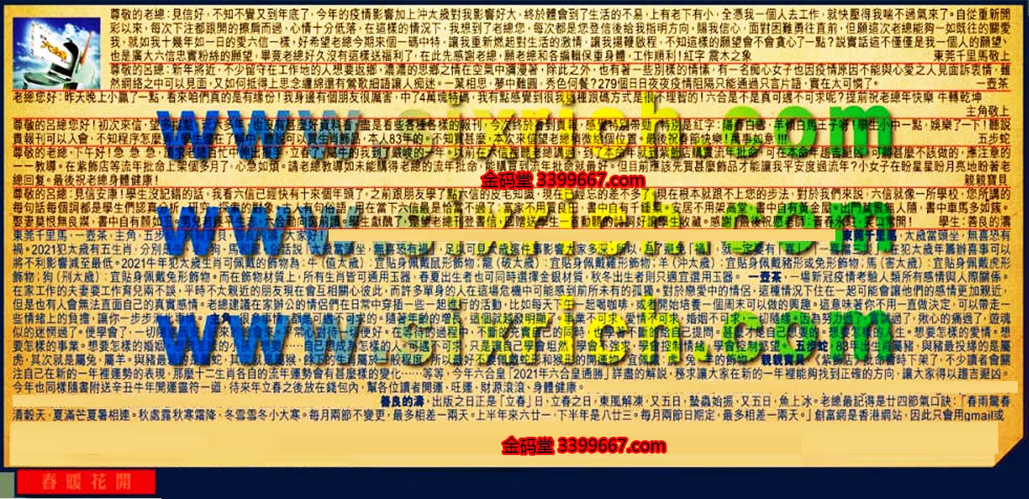 【1】.尊敬的老總:見信好,不知不覺又到年底了,今年的疫情影響加上沖太歲對我影響好大,終於體會到了生活的不易,上有老下有小,全憑我一個人去工作,就快壓得喘不過氣來了。自從重新開彩以來,每次下注都跟開的擦肩而過,心情十分低落,在這樣的情況下,我想到了老總您,每次都是您登信後給我指明方向,賜我信心,面對困難勇往直前,但願這次老總能夠一如既往的關愛我,就如我十幾年如一日的愛六信一樣,好希望老總今期來個一碼中特,讓我重新燃起對生活的激情,讓我揚鞭啟程,不知這樣的願望會不會貪心一點?說實話這不僅僅是我一個人的願望、也是廣大六信忠實粉絲的願望,畢竟老總好久沒有這樣送福利了,在此先感謝老總,願老總和各編輯保重身體,工作順利!紅字 震木之象 東莞千里馬敬上