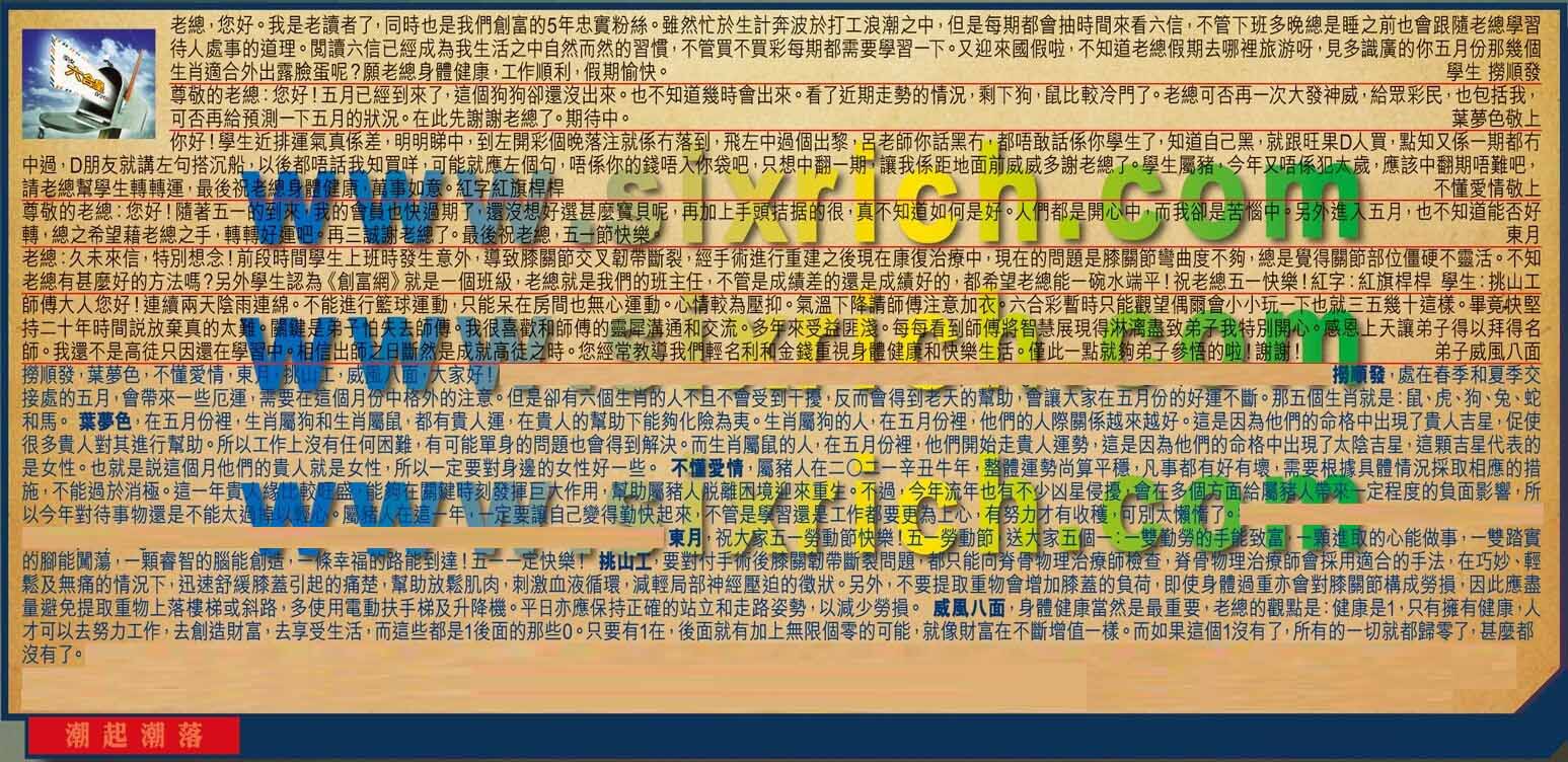 【1】.老總,您好。我是老讀者了,同時也是我們創富的5年忠實粉絲。雖然忙於生計奔波於打工浪潮之中,但是每期都會抽時間來看六信,不管下班多晚總是睡之前也會跟隨老總學習待人處事的道理。閱讀六信已經成為我生活之中自然而然的習慣,不管買不買彩每期都需要學習一下 。又迎來國假啦,不知道老總假期去哪裡旅游呀,見多識廣的你五月份那幾個生肖適合外出露臉蛋呢?願老總身體健康,工作順利,假期愉快。 學生 撈順發