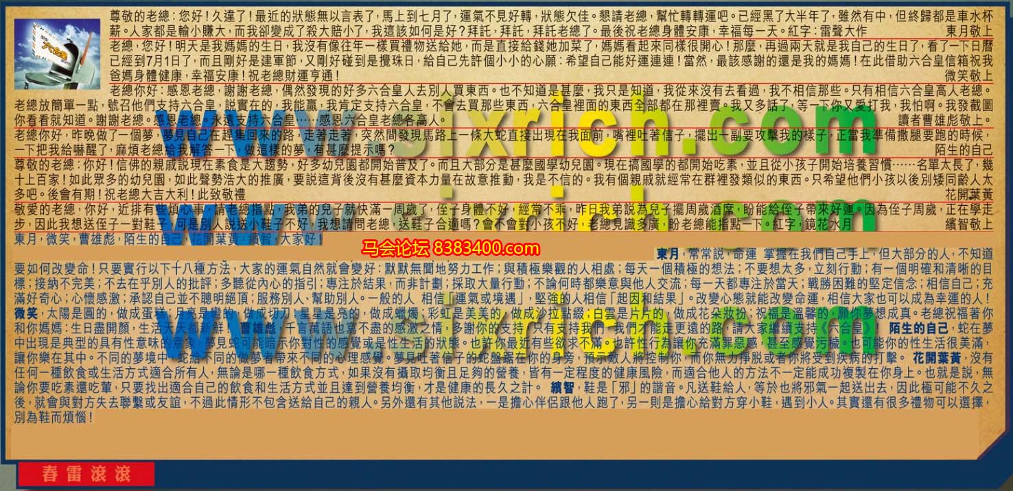 【1】.尊敬的老總:您好!久違了!最近的狀態無以言表了,馬上到七月了,運氣不見好轉,狀態欠佳。懇請老總,幫忙轉轉運吧。已經黑了大半年了,雖然有中,但終歸都是車水杯薪。人家都是輸小嫌大,而我卻變成了殺大賠小了,我這該如何是好?拜託,拜託,拜託老總了。最後祝老總身體安康,幸福每一天。紅字:雷聲大作 東月敬上