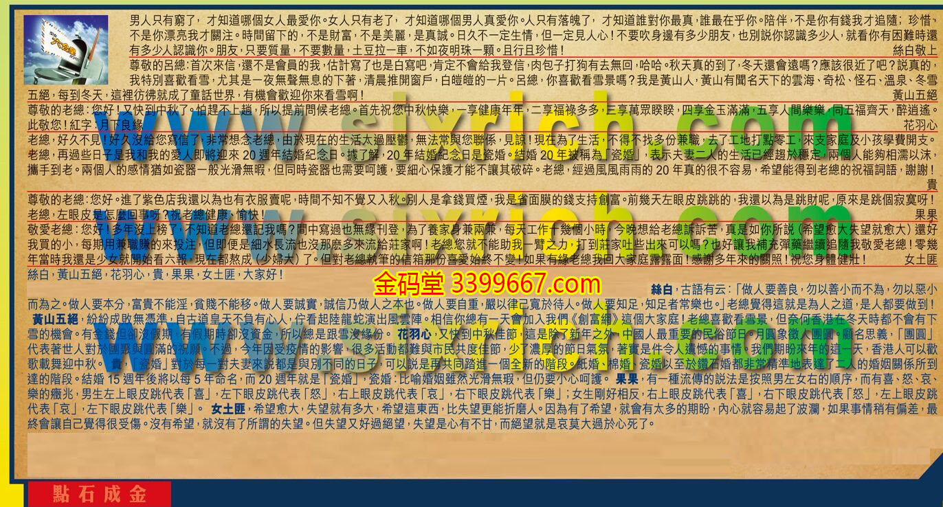【6】.敬愛老總:您好!多年沒上榜了,不知道老總還記我嗎?間中寫過也無緣刊登,為了養家身兼兩兼,每天工作十幾個小時,今晚想給老總訴訴苦,真是如你所說(希望愈大失望就愈大)還好我買的小,每期用兼職賺的來投注,但即便是細水長流也沒那麼多來流給莊家啊!老總您就不能助我一臂之力,打到莊家吐些出來可以嗎?也好讓我補充彈藥繼續追隨我敬愛老總!零幾年當時我還是少女就開始看六報,現在都熬成(少婦大)了。但對老總執筆的信箱那份喜愛始終不變!如果有緣老總我回大家庭露露面!感謝多年來的關照!祝您身體健壯! 女土匪
