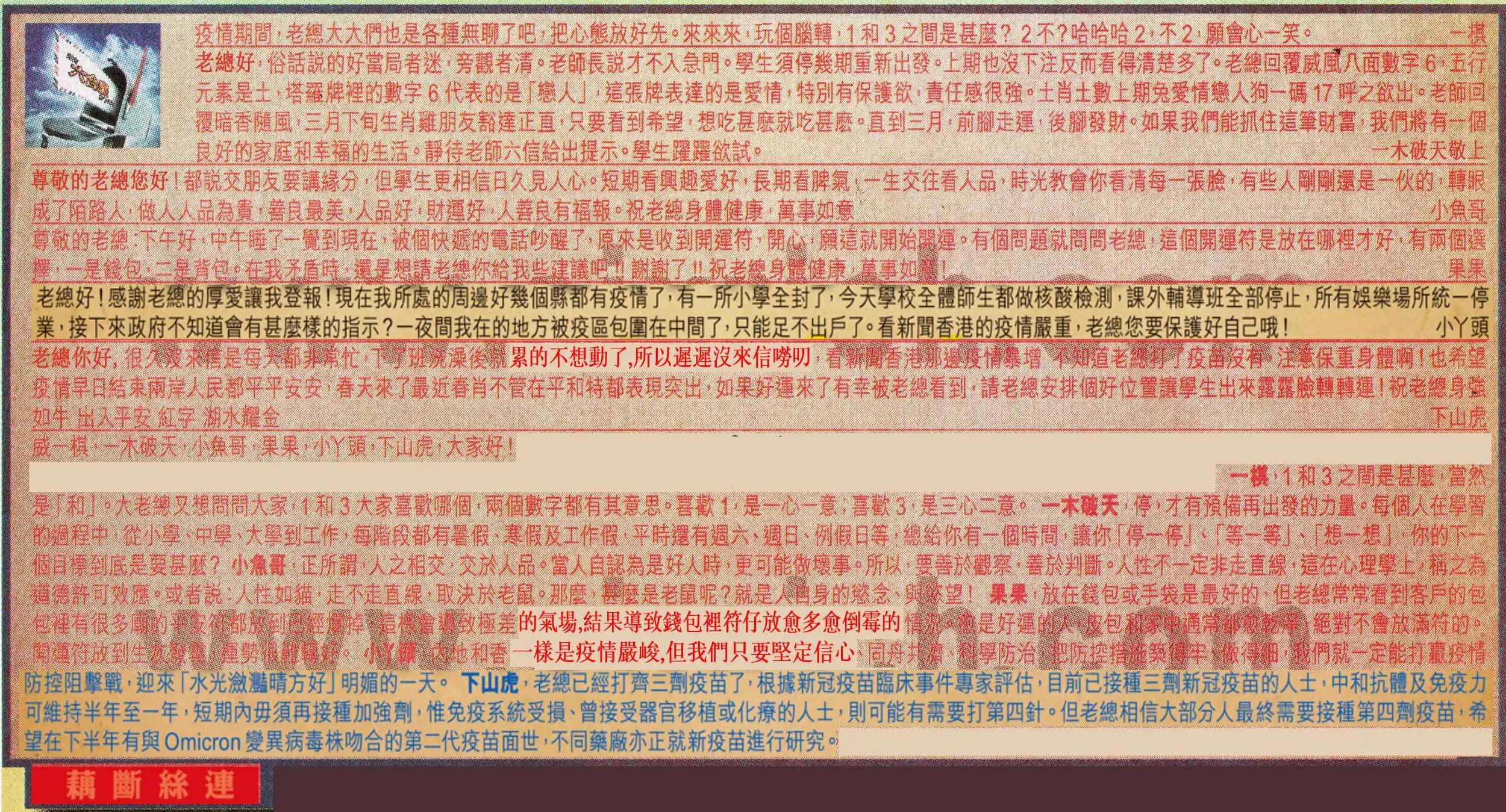 【6】.老總你好,很久沒來信是每天都非常忙,下了班洗澡後就累的不想動了,所以遲遲没來信嘮叨,看新聞香港那邊疫情暴增 不知道老總打了疫苗沒有,注意保重身體啊!也希望疫情早日結束兩岸人民都平平安安,春天來了最近春肖不管在平和特都表現突出,如果好運來了有幸被老總看到,請老總安排個好位置讓學生出來露露臉轉轉運!祝老總身強如牛 出入平安 紅字 湖水耀金  下山虎