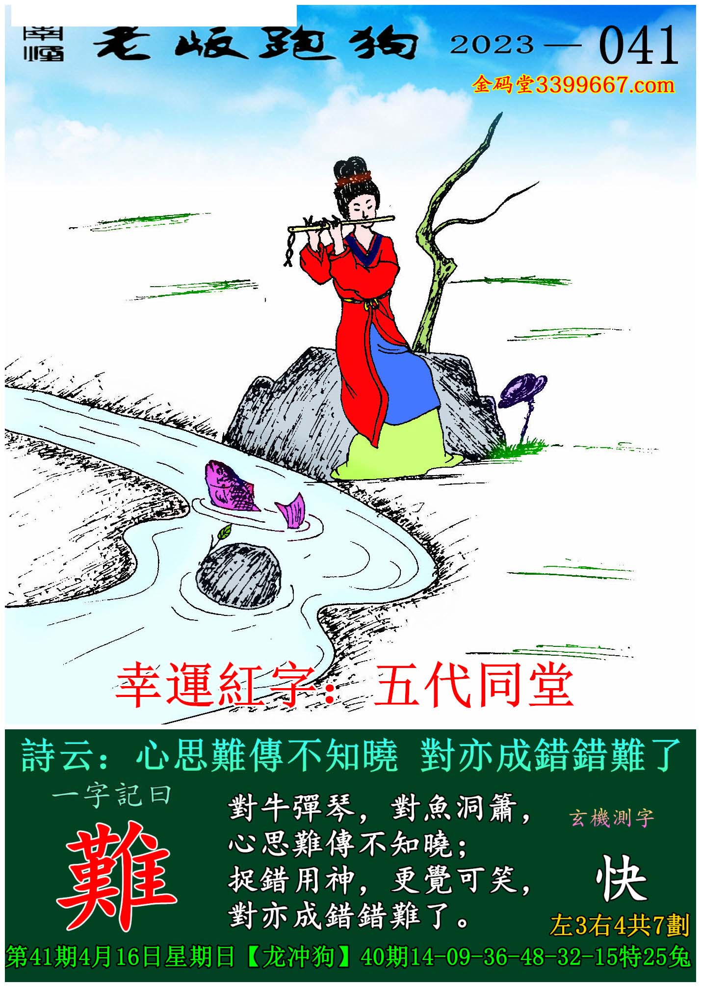 041期老版跑狗一字記之曰:【難】玄機測字:《快》