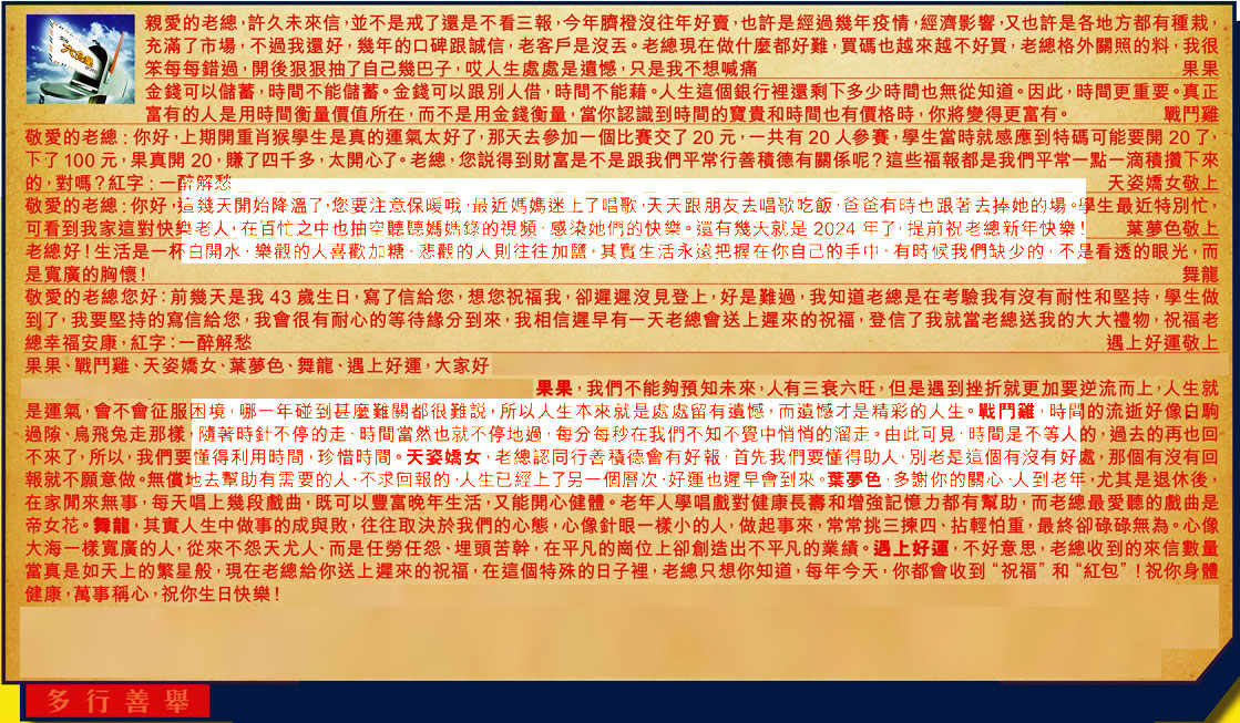 【6】.敬愛的老總您好:前幾天是我 43 歲生日,寫了信給您,想您祝福我,卻遲遲沒見登上,好是難過,我知道老總是在考驗我有沒有耐性和堅持,學生做到了,我要堅持的寫信給您,我會很有耐心的等待緣分到來,我相信遲早有一天老總會送上遲來的祝福,登信了我就當老總送我的大大禮物,祝福老總幸福安康,紅字:一醉解愁 遇上好運敬上