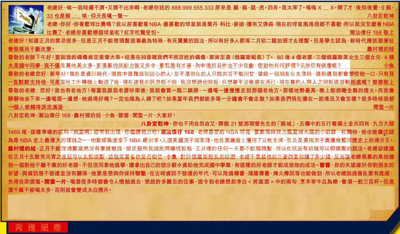 【1】.老總好,唉~我時運不濟。又猜不出來啊,老總你送的 888.999.555.333 原來是 雞,猴,鼠,虎。四肖。我太笨了。嗚嗚 X ﹏ X。開了才,後知後覺,9 猴,33 也是猴......唉,仰天長嘆一聲~  八卦定乾坤