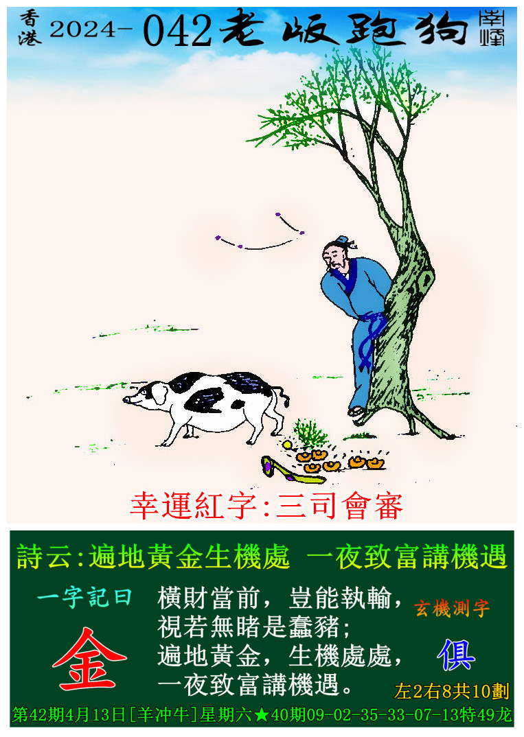 042期老版跑狗一字記之曰:【金】 玄機測字:《俱》