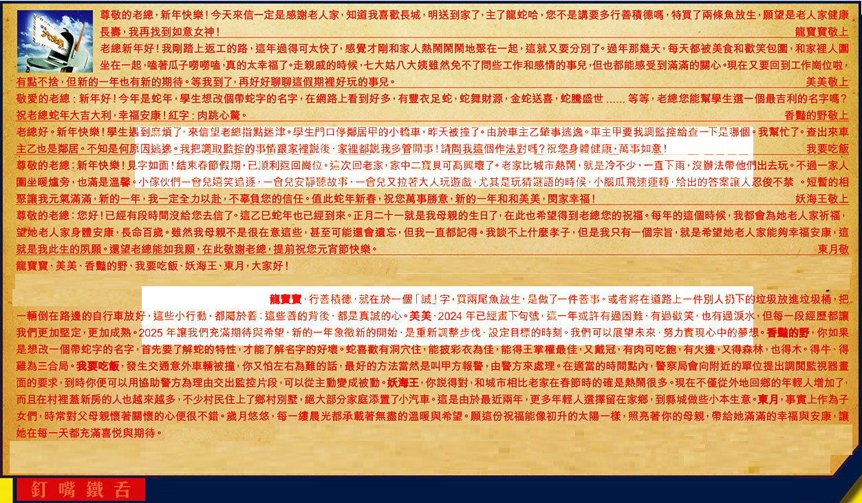 【3】.敬愛的老總:新年好!今年是蛇年,學生想改個帶蛇字的名字,在網路上看到好多,有豐衣足蛇,蛇舞財源,金蛇送喜,蛇騰盛世......等等,老總您能幫學生選一個最吉利的名字嗎?祝老總蛇年大吉大利,幸福安康!紅字:肉跳心驚。 香豔的野敬上