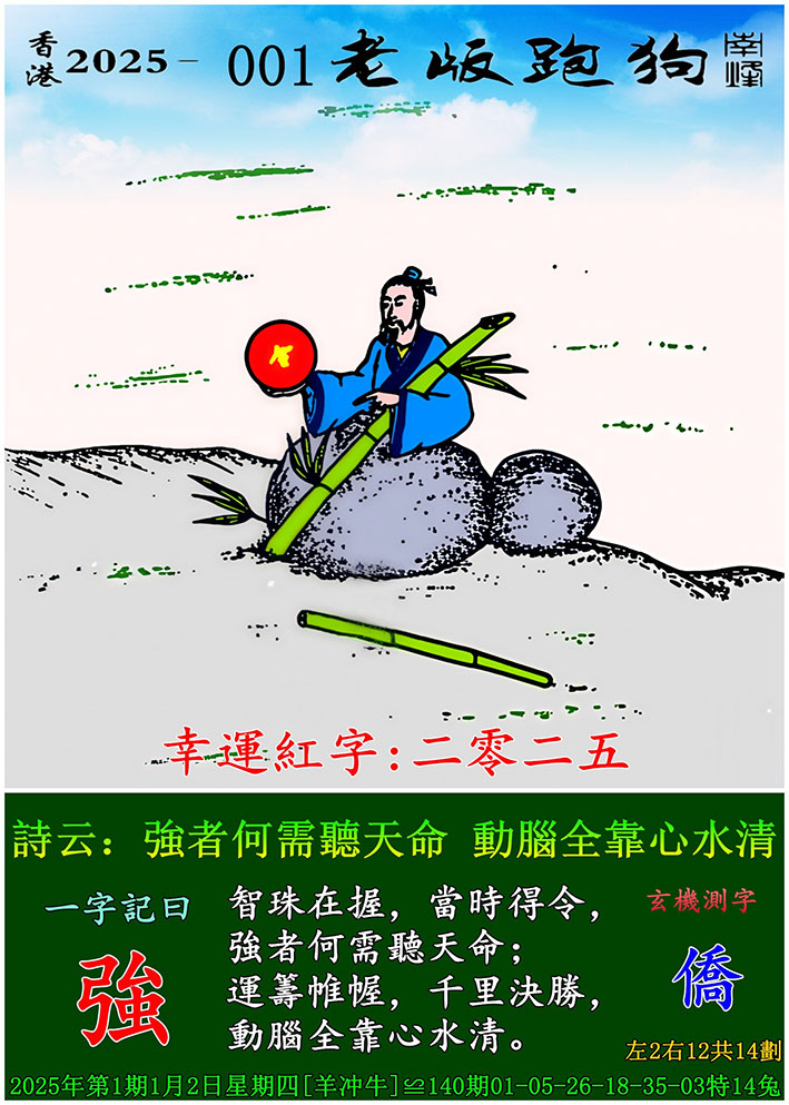 001期老版跑狗一字記之曰:【強】 玄機測字:《僑》